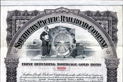 1905. $1,000. Specimen 4% Gold bond. Vignettes of allegorical woman and teen age boy flanking railroad tracks heading into sunset or sunrise (depends if you are an optimist and pessimist). XF condition. Red specimen overprints, POC's and "00000" serial numbers. Coupons attached. Dark brown border. Rare certificate. IBNC.