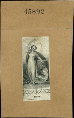 1830-1850's. Proof. 7 different standing allegorical women vignette proofs printed on india paper and mounted on manila cards with plate numbers on vignettes and cards. Mostly used on obsolete banknotes and checks or drafts. All have printer unattributed. All are in Fine to choice condition with some light glue staining and toning. All unique in archive.