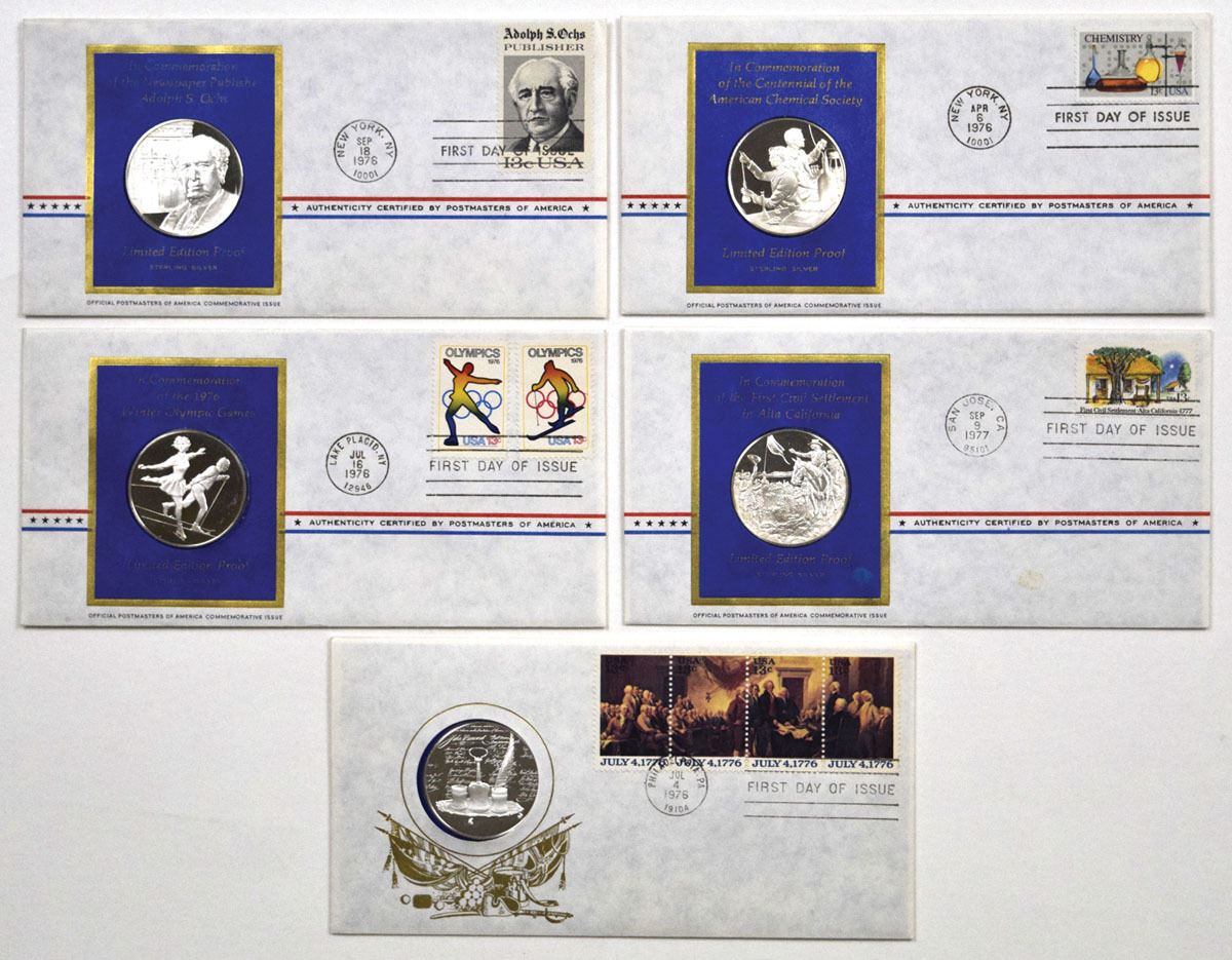 U.S., 1976 to 1977. Lot of 5 Limited Edition Proof sterling silver commemorative medals mounted in First Day Cover envelopes with commemorative stamps and cancellation marks, issued in the Official Postal Medallion series. Themes include Winter Olympic Games, American Chemical Society, Alta California, Adolph S. Ochs, and the U.S. Bicentennial. Medals are struck in .925 fine silver, each weighing 24.2 grams and measuring about 39 mm in diameter. Total weight for all 5 coins is 121 grams, with an actual silver weight (ASW) of 112g grams (3.6 troy oz). Estimated Melt with Silver at $80 ounce is $288. Housed in original covers. (5).