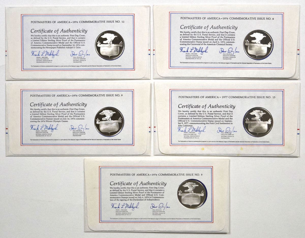 U.S., 1976 to 1977. Lot of 5 Limited Edition Proof sterling silver commemorative medals mounted in First Day Cover envelopes with commemorative stamps and cancellation marks, issued in the Official Postal Medallion series. Themes include Winter Olympic Games, American Chemical Society, Alta California, Adolph S. Ochs, and the U.S. Bicentennial. Medals are struck in .925 fine silver, each weighing 24.2 grams and measuring about 39 mm in diameter. Total weight for all 5 coins is 121 grams, with an actual silver weight (ASW) of 112g grams (3.6 troy oz). Estimated Melt with Silver at $80 ounce is $288. Housed in original covers. (5).
