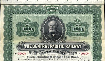 1899. $1,000. Specimen 1st Refunding Mortgage 4% Gold bond. Green border. Portrait of notable on top and speeding train on bottom. XF condition. Red specimen overprints, POC's and "00000" serial numbers. Coupons attached. Extremely rare certificate. ABNC.