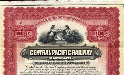 1904. $1,000. Specimen "Through Short Line", 1st Mortgage 4% Gold bond. Red border. Allegorical women flank patriotic shield. XF condition. Red specimen overprints, POC's and "00000" serial numbers. Coupons attached. Rare certificate. ABNC.