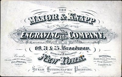 ca.1860's-70's. "The Major & Knapp Engraving (Mfg.& Lith.) Company. 69, 71 & 73 Broadway, New York". Famous early engravers and lithographer printers. Card is intaglio printed on white coated stock. Some light toning on the top 1/5th of the card, but otherwise it appears in XF condition. Rare business card from this famous company.