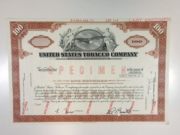 U.S. Tobacco Co., 1971 Specimen Stock Certificate, 100 Shrs, Brown, XF, ABN.