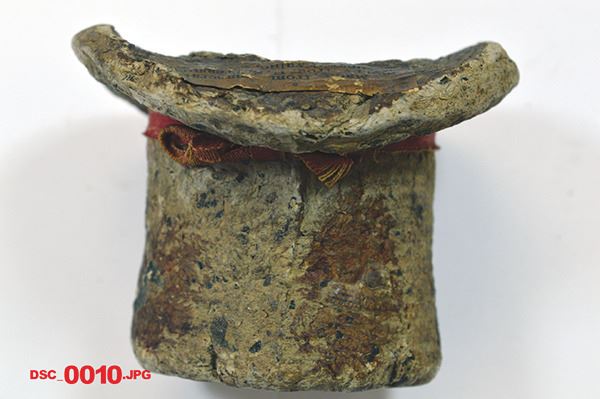 Macerated currency, Top hat with red ribbon, ca.1860-1920's. Bottom label states $2000 worth of currency went into manufacturing this macerated hat, VF.