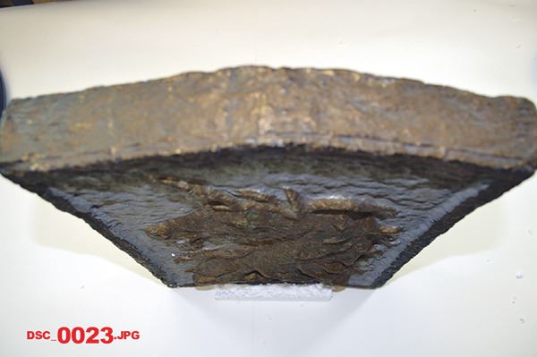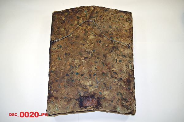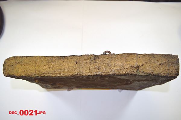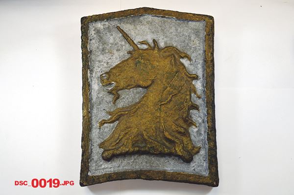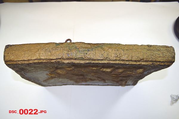 Macerated currency, Large format, 14 x 11 x 2 inches, ca.1860-1920's. painted gold with silver background, No label present but based on the size of the other items offered and the weight of this macerated currency item, there is easily over 50 times or possibly more (Estimated $100,000) worth of currency versus the smaller objects which were made up of about $2000 worth of currency each, VF condition.