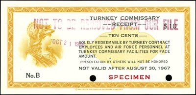 1966. P-Unlisted. 10 Cents. Helmeted Woman on left. Handstamped in red "OCT 21, 1966". Large red overprint on front of note "Not to be Removed From Our File". Note states "Socely Redeemable by Turnkey Contract Employees and Air Force Personnel at Turnkey Commissary Facilities for Face Amount. Not Valid After August 30, 1967". Private scrip note very closely to MPC related note for use in Vietnam. SCBN.