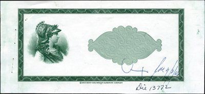 1966-67. P-Unlisted. Proof of $10 border in green with helmeted woman and undertint, no text. Ink notations on margins "OK" correction of adding copy right to lower SCBNC imprint. Choice Unc. Includes photo proof of $1 requesting correction. Also included is proof of text and denomination mounted on tracing paper that was used on each note. Unique in archive. SC-BNC.