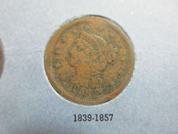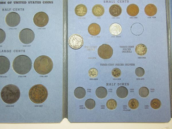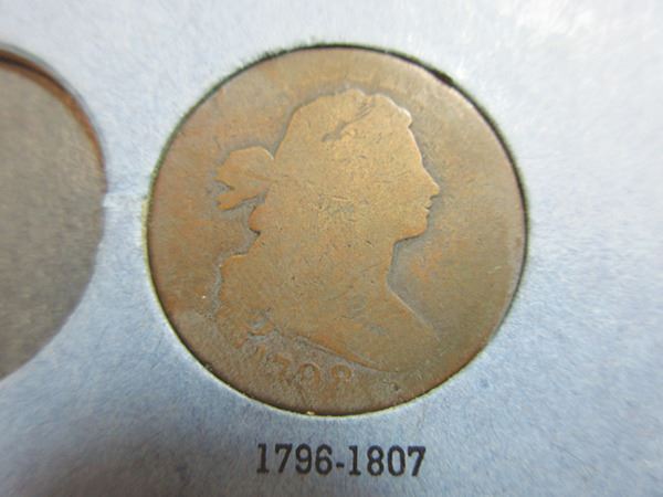 Lot of 21 coins. Highlights include 1807, 1/2ct, VG to Choice VG; 1856, 1/2ct, VG; 1798, Large 1ct, Almost Good to Good; 1817 and 1856 large Cent, Almost good to good; 1858 Flying eagle, VG; Indian cents 1859, 1909 VF; Lincoln cents 1909VDB AU/Unc.; 1866 2ct, VG/Ch.VG; 3ct nickel and 2 examples 3ct silver, Almost good to good; Half dimes, 1857 VF, 1853 arrows, VG and 1871, Good; Liberty Nickel, 1883, AU/Unc.; and Dimes, 1834 bust dime, Good.