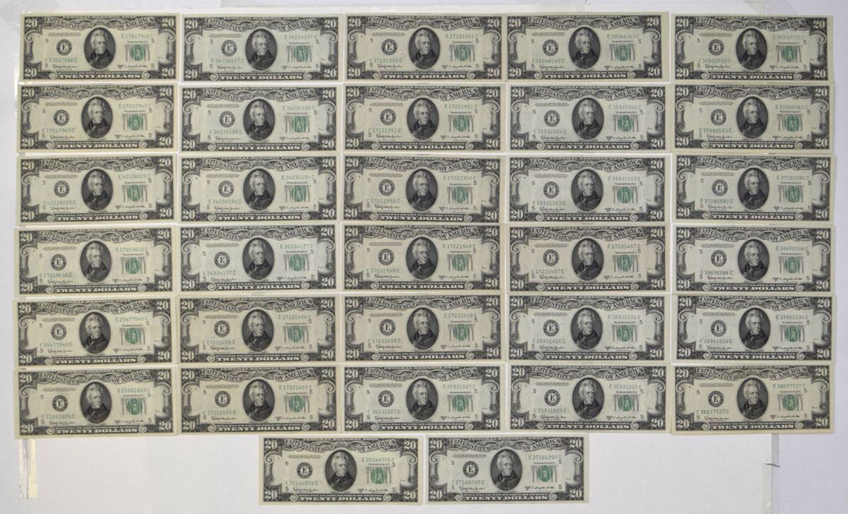 Richmond, Virginia,,,,,,, 1950. Lot of 32 notes, all are $20, Series of 1950D, Fr.# 2063-E (32), EC Block, Issued FRN Banknote, Green seal at right, Granahan | Dillon signatures, AU to UNC condition. (32 notes with a Face Value of $640). Sold "AS IS" no returns accepted.