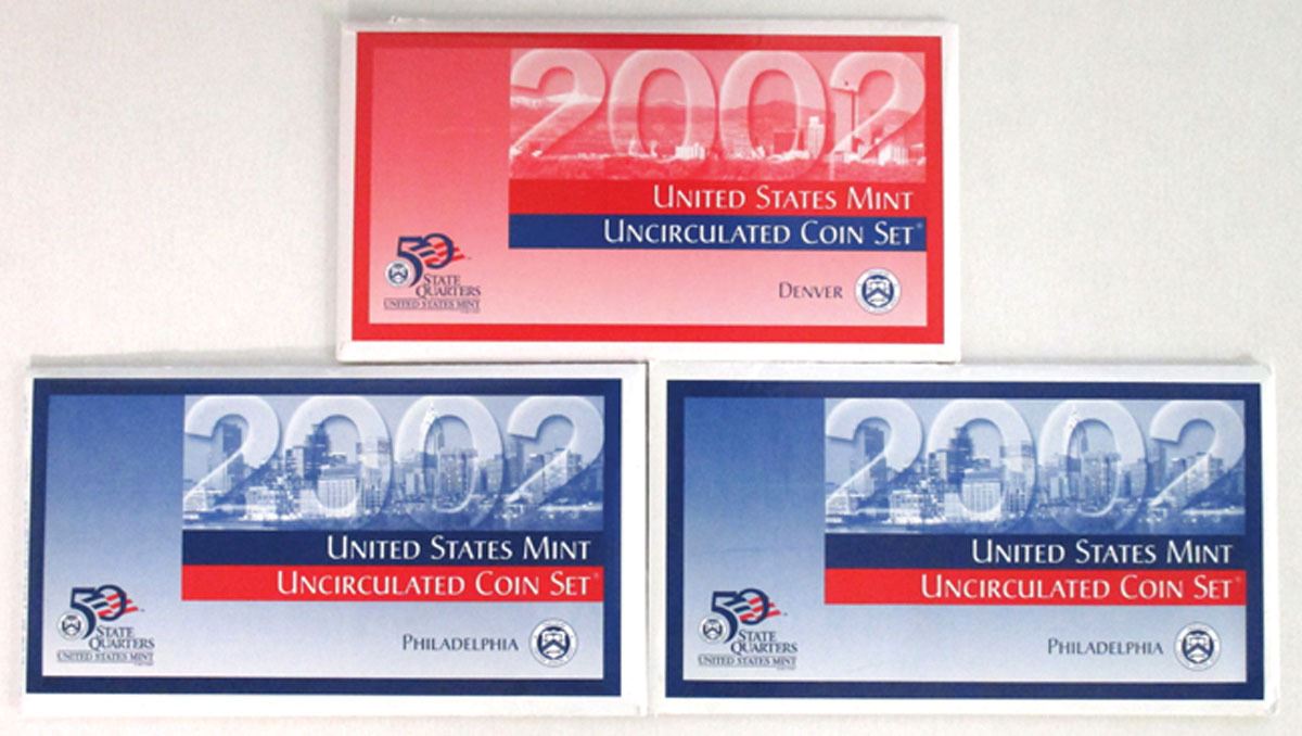 Colorado & Pennsylvania, 2002. Lot of 3 Mint Sets, 2 from Philadelphia Mint and 1 from Denver Mint, Sets include run of Coins and run of State Quarters, UNC to Gem UNC condition. (3).