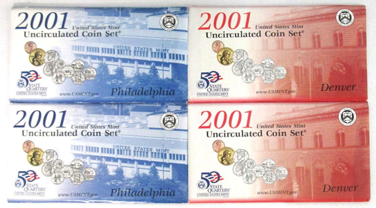 Colorado & Pennsylvania, 2001. Lot of 4 Mint Sets, 2 from Philadelphia Mint and 2 from Denver Mint, Sets include run of Coins and run of State Quarters, UNC to Gem UNC condition. (4).