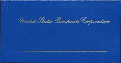 ca.1950-70's. 27 color sample color pages bound in a blue leatherette style folder with "United States Banknote Corporation" in gold letters on front of booklet. 7 by 3.75 inches. Each page has an allegorical vignette of a seated woman holding a globe with lathe work border engraving on right with facsimile corporate seal. Each page has a number and color description. Choice Uncirculated. USBNC.
