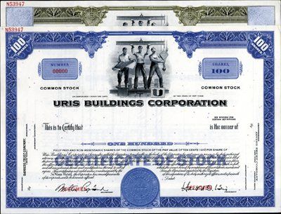 100; Odd Shs. 2 different specimens. Common Stock. Olive green and blue borders. Iron workers standing on metal beam with NYC in background. Famous New York builders and developers, Harold D. Uris (Civil Engineering, 1925) and his brother, Percy Uris were the founders of Uris Building Corp. in New York City. They built and developed the following buildings: Look Building (1950); 2 Broadway (1959); Sperry-Rand Building (1962); New York Hilton Hotel (1963) (with Rockefeller Center Development Corp.); American Brands Building (1967); Paramount Plaza (1968) and 55 Water Street (1972). Rare certificates. ABNC.