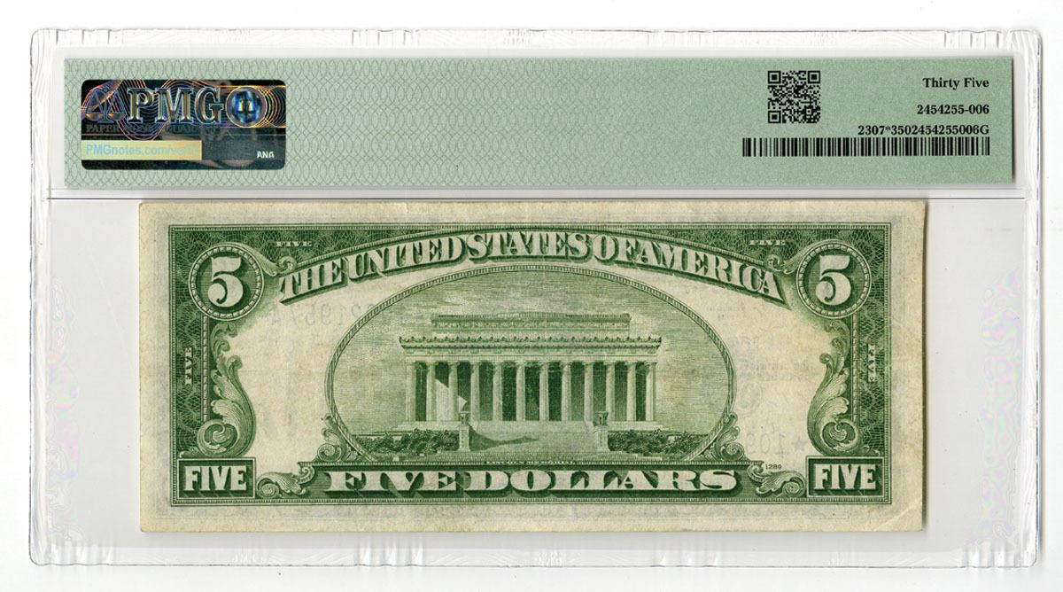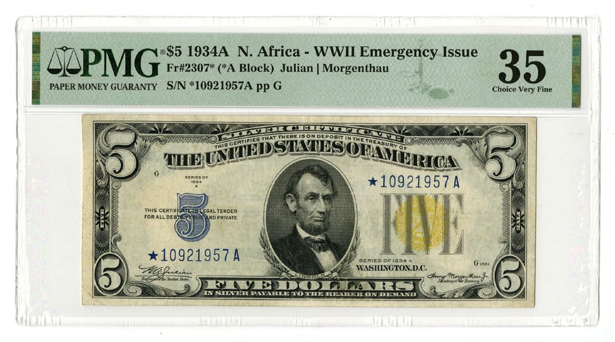 Washington, D.C., $5, 1934A, N. Africa Emergency Issue, Fr.#2307* (A* Block), Julian | Morgenthau signatures, S/N *10921957A pp G, PMG graded Choice Very Fine 35, a very attractive note that appears as a Choice XF to AU note at first glance with the only issue is a strong corner bend on the lower left corner, otherwise, the note would have graded a nice XF to AU, a superior example for the grade.