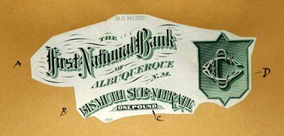 ca.1870's-80's. 7 different proof banking related documents from Nevada, Montana, New Mexico, Kansas and Dakota. 6 are printed in green and one in black on large manila file cards with plate numbers. All are unique in archive. 1). "The First National Bank of Albuquerque" (New Mexico) with additional logo in shield and another company listed on the same proof; 2). "Santa Fe, First National Bank, 187-" (New Mexico) with the title cancelled in the plate; 3). "The First National Bank of Reno" (Nevada, ca. 1880's); 4). Bank of Dodge City, Dodge City " (Kansas); 5). "The Lead City Bank, Lead City, DAK."; 6). "Bozeman National Bank" (Montana Territory); 7). Alice Gold & Silver Mining Co. Check and Letterhead Proof. All in choice condition. Rare Western related proofs. ABNC.