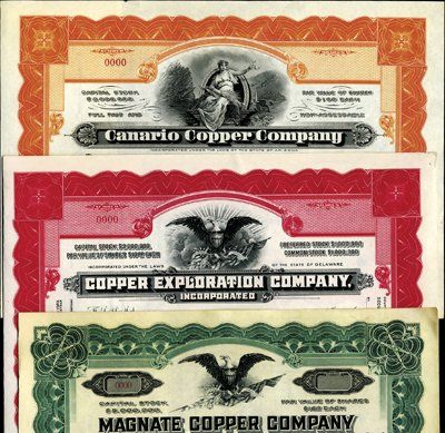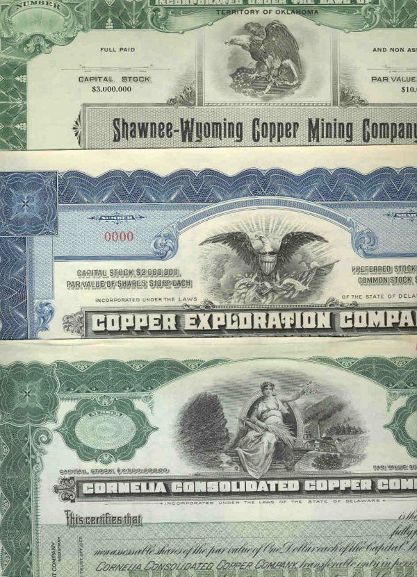 ca.1900-1930's. 7 different specimens. Copper Exploration Company Inc.; Magnate Copper Co.; Cornelia Consolidated Copper Co.; Shawnee-Wyoming Copper Mining Co.; Seaboard Copper Mining Co.; Canario Copper Co. Various "Specimen" overprints and POC's. All in different colors, vignettes and share amounts. Condition ranges between VF to XF. Scarce and attractive copper mining stocks. SBNC.