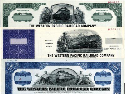 ca.1940's-90's. 7 different specimen certificates. Railroads include: Western Pacific Railroad Co. (3); Union Pacific Corp. and Chicago Milwaukee St. Paul and Pacific Railroad Co. (3). All in XF condition. Scarce group. Various printers.
