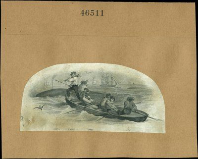 1840-50's. Large size Vignette. Spouting whale about to be harpooned by whaleboat with in foreground and small whaling vessels in back ground. In background is a floating dead Whale with American Flag on it. About 3 inces by 2 inches. Plate # PHIL V46511. Unique in archive.