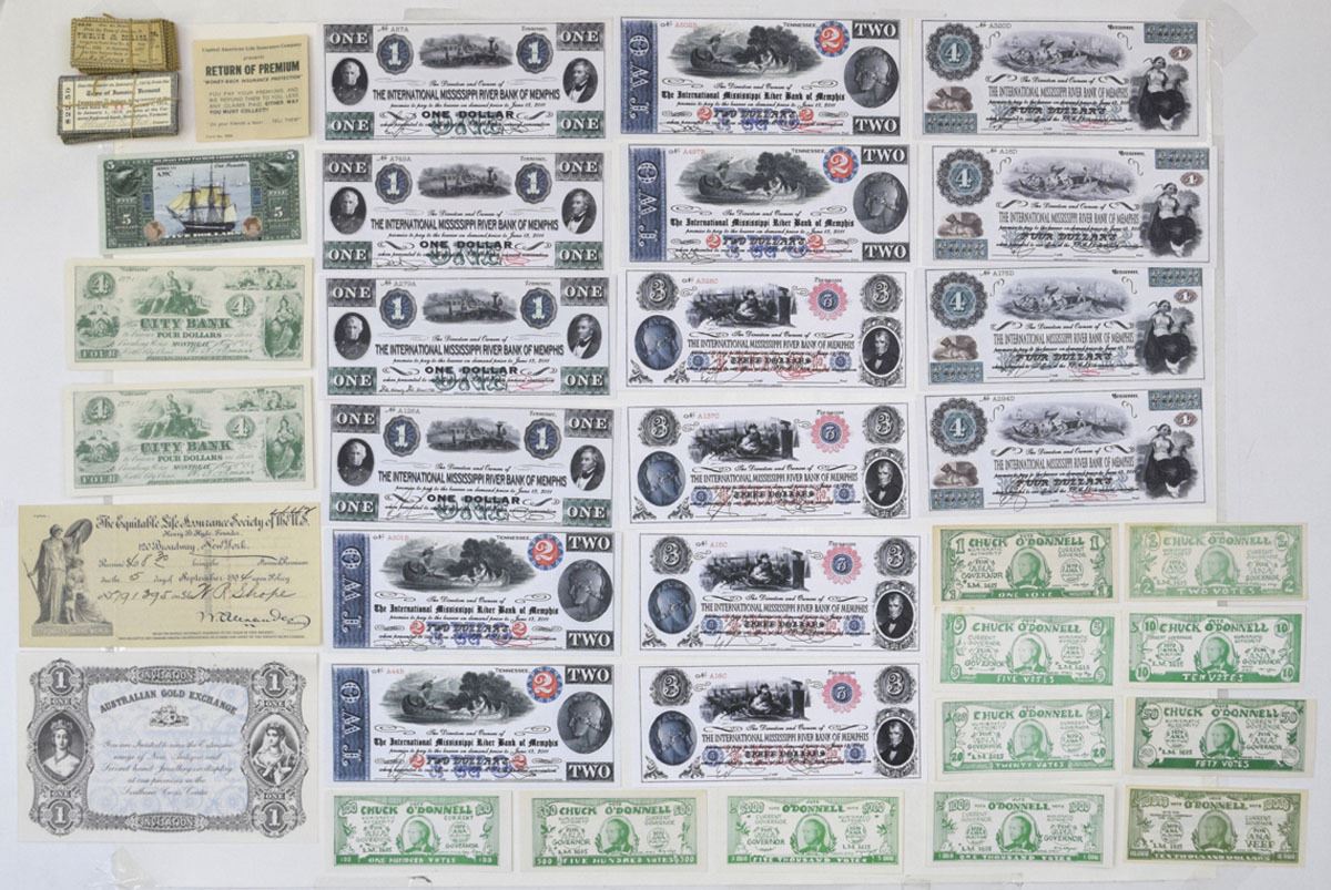 United States and Australia, ca. 1850-1970s. Lot of 150+ Obsolete Banknote Remainders, Advertising Notes, and Fantasy Issued Notes, Includes: The International Mississippi River Bank of Memphis complete $1, $2, $3, and $4 remainders (multiple examples of each); City Bank $4 Convention Reprints; and Australian Gold Exchange $1 Advert Note featuring Queen Victoria. Also features 1970s-era Chuck O’Donnell “Vote” Notes in denominations from 1 to 1000, a Peoples National Bank Advertising Note, and miscellaneous life insurance and premium coupons. Lot also includes Jamica, Vermont, 1915, Town Bond Coupons. Designs include allegorical scenes, early portraits, ships, and trade imagery. Conditions range from VF to UNC overall, with minor handling. (150+). Sold "AS IS" no returns accepted.