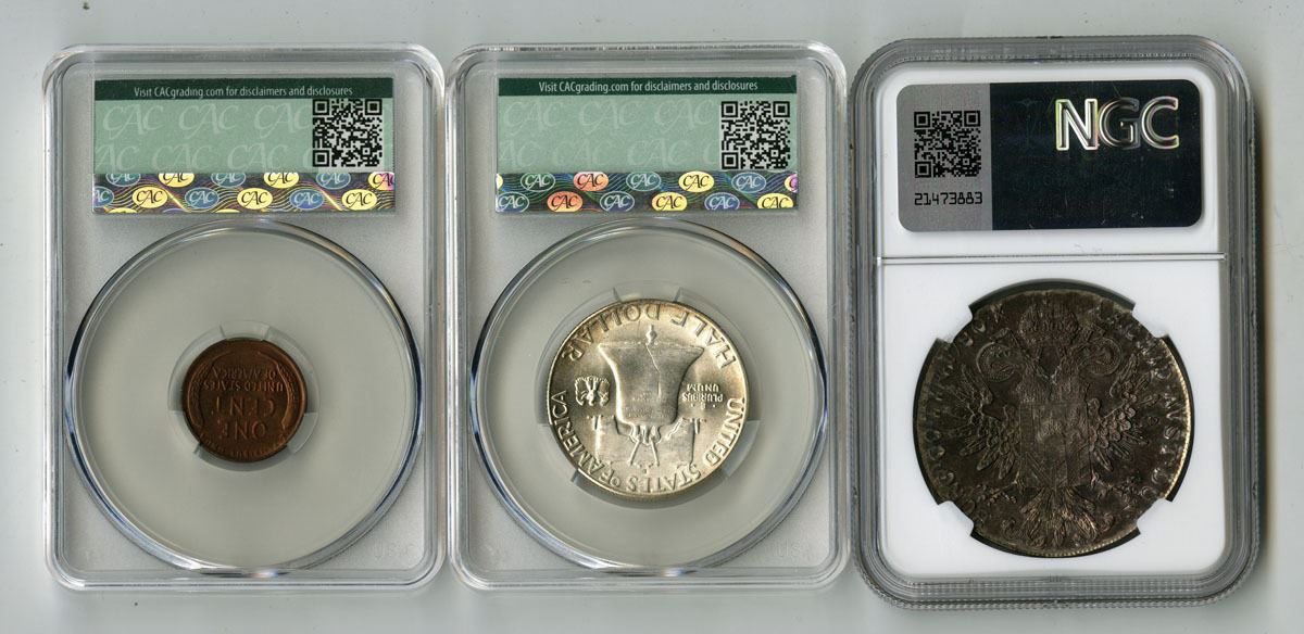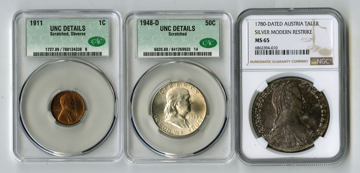 Austria & USA, 1798-1948. Lot of 3 Graded Coins, Includes: Austria, 1780 dated Austria Taler (Modern Silver Restrike). 1 Taler, NGC graded MS 65, asw: .75 ounces, $22 Melt, extremely attractive toning; 1 Cent, 1911-P. CAC graded UNC Details - Scratched, Obverse, nice red-brown with the scratch difficult to view; and, 50 Cents, 1948-D, CAC graded Unc Details - Scratched, attractive coin with minimal bag marks and appears to have FBLs. (3). Sold "AS IS" no returns accepted.