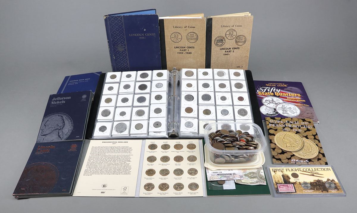 in 18 different coin books and binders; 200 world coins are housed in a black binder with most of the coins in VF to Uncirculated condition and dating between the 1880s until the 1980s; a small plastic tub holds about 2 pounds of mixed world coins, mostly modern and non-silver, but unsearched; U.S. is highlighted by a Presidential Dollar book by Littleton holding 24 Uncirculated dollars from 2007 to 2012; a complete 1998 to 2008 State Quarters book is included with 106 Uncirculated state quarters; one Indian Head Cent book filled with 28 Indian Cents, mostly after the 1890s in Good to VG condiution; three Jefferson nickel books, mostly filled with circulated nickels, and 11 Lincoln penny books, mostly dating from 1941 on with earlier dates scattered in the first book; over 400 coins in all. Shipping charges apply - weight 24 lbs. (photo on web site)