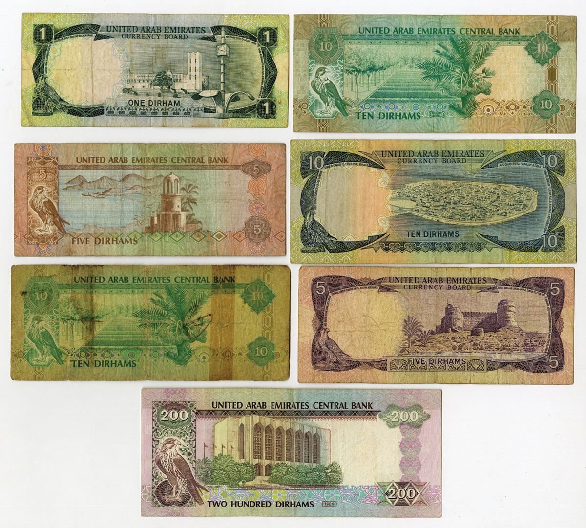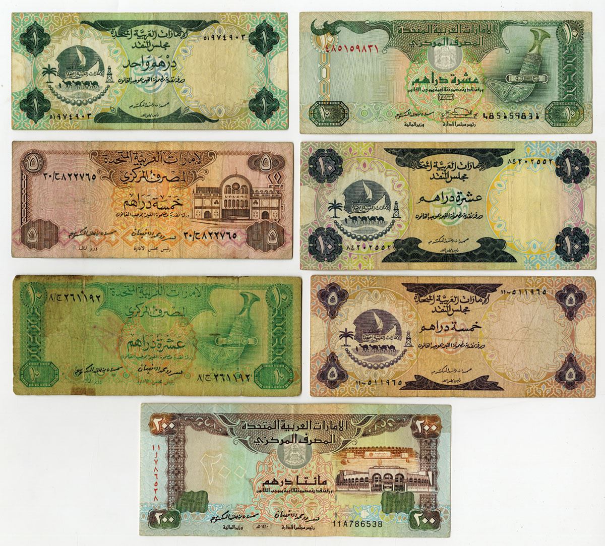 United Arab Emirates, ND(1973)-2001. Lot of 7 Issued Banknotes, Includes: United Arab Emirates Currency Board 1 Dirham, P-1a, ND (1973), TDLR; 5 Dirhams, P-2a, ND (1973), TDLR; 10 Dirhams, P-3a, ND (1973), TDLR; United Arab Emirates Central Bank 5 Dirhams, P-7a, ND (1982); 10 Dirhams, P-8a, ND (1982); 200 Dirhams, P-16, 1989; 10 Dirhams, P-20b, 2001. Notes range from VF to XF condition. (7).