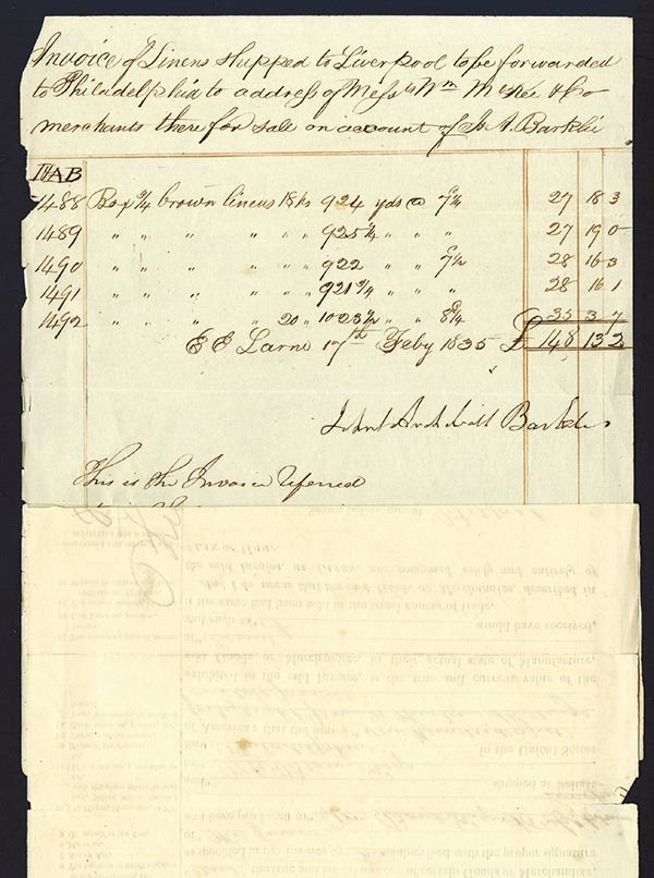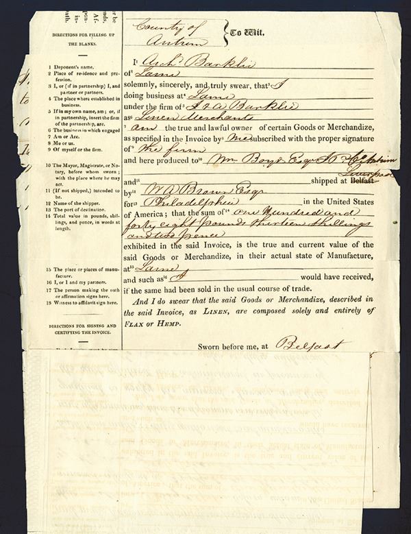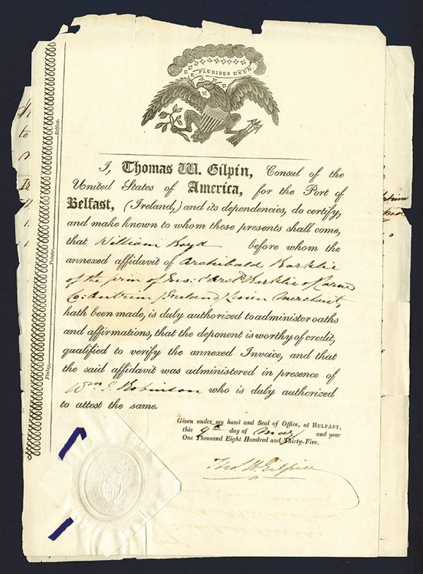 United States. Import document of Linen Merchant, 3 pages which also includes invoice, attached with ribbon and Consul seal. Light paper loss and tears due to fragile nature of the paper used.