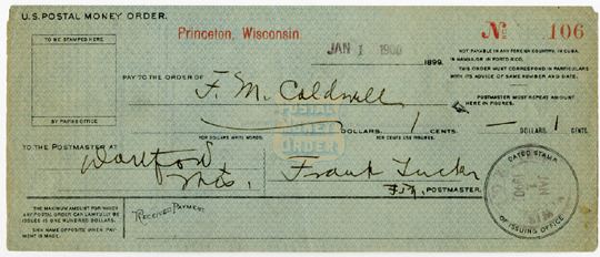 Princeton, WI. Money order for 1 Cent issued on January 1, 1900. S/N 106. Very Fine. Rare item that took the place of U.S. Postal Notes.