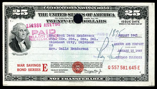 US War Savings Bond, 1945, Issued by Armour and Co. United States War Savings Bond $25.00 Issued through Armour and Company, Chicago, IL 7th War Loan Jan 1945, PCGS Choice About New 58 PPQ. Schwan/Boling 232. Wonderful example from the "Oklahoma Hoard" of cancelled WWI Bonds Issued through Armour and Company, The maker of SPAM. By war’s end, the military had bought, shipped, and served roughly 150 million pounds of Spam. Washington at Left, PHC, Red Serial Number, Treasury Seal and WAR SAVINGS BOND Legend. PHC