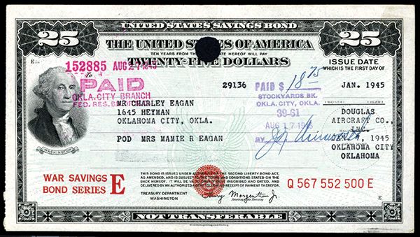 US War Savings Bond, 1945, Issued by Douglas Aircraft. United States War Savings Bond $25.00 Issued through Douglas Aircraft, Oklahoma City, OK, 7th War Loan Jan 1945, PCGS Choice NEW 63 PPQ. Schwan/Boling 232. Wonderful example from the "Oklahoma Hoard" of cancelled WWI Bonds Issued through Douglas Aircraft Factory. That Douglas plant produced 5,354 C-47s from March 1943 until August 1945. Washington at Left, PHC, Red Serial Number, Treasury Seal and WAR SAVINGS BOND Legend. PHC