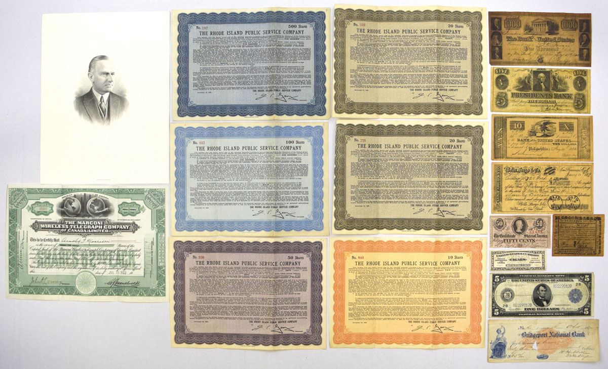 USA & Canada...., 1800s to 1920s. Lot of financial ephemera including 6 issued stock certificates of The Rhode Island Public Service Co. representing denominations of 10, 20, 50, 100, and 500 shares, printed with ornate colored borders and detailed corporate text; a Wireless Telegraph Co. of Canada, Ltd. issued stock certificate dated July 25, 1923; an engraved portrait proof print likely related to security printing production; and a group of obsolete U.S. banknotes, checks, and related paper currency items, including examples from The Bank of the U.S., Presidents Bank, Bridgeport National Bank, and other 19th century financial institutions, along with a Series 1928 $5 Federal Reserve Note. Items show varying degrees of wear, folds, and aging consistent with circulated financial documents and early security printing material. Conditions range from Fair to Very Fine overall, with some faults typical for documents of this age. (17). Sold “AS IS” no returns accepted.