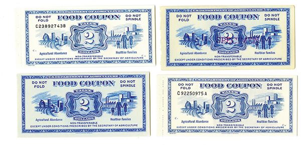 Washington, D.C., Lot of 4 USDA Food Coupons. Includes $2 1971(Perforated on left) and 1973 (Rouletted on left) dated coupons with serial numbers and plate position and 2 examples with no date, serial number or plate position, one with purple SPECIMEN overprint, Farm and stored grains at center, family with buildings and factory in background at right. All Uncirculated, but specimen has slightly rounded corners. 4 pieces. BEP.