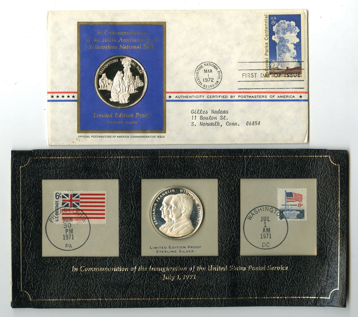 U.S., 1971-72. Lot of 2 Limited Edition Proof sterling silver commemorative medals, Includes: One cover commemorates the John Hanson Bicentennial with a U.S. 8¢ stamp cancelled “May 9, 1972 – First Day of Issue,” while the second marks the fiftieth anniversary of the United States Postal Service with patriotic stamps cancelled July 1, 1971 in Philadelphia and Washington, D.C. Medals are struck in sterling silver (.925 fineness) with proof surfaces, each weighing approximately 20 grams. Total weight for the lot is approximately 40 grams, with an actual silver weight (ASW) of approximately 18.5 grams per medal, or about 37 grams total (1.19 troy oz). Items remain housed in their original commemorative postal covers and presentation holder. (2). Sold “AS IS” no returns accepted.