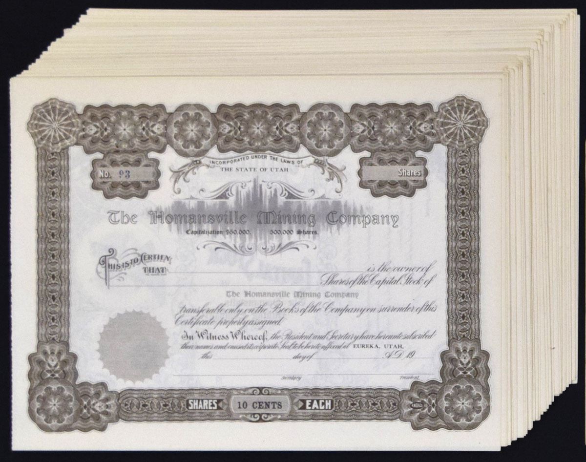 Eureka, Utah, ND (1900-20s). Lot of 75 U/U Capital Stock Certificates, Black print with brown border, Company name at top center, Certificates are in AU to UNC condition. R. M. B. N. Co. (75). Sold "AS IS" no returns accepted.