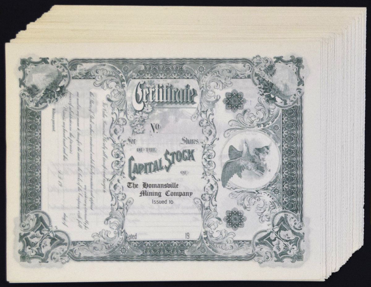 Eureka, Utah, ND (1900-20s). Lot of 75 U/U Capital Stock Certificates, Black print with brown border, Company name at top center, Certificates are in AU to UNC condition. R. M. B. N. Co. (75). Sold "AS IS" no returns accepted.