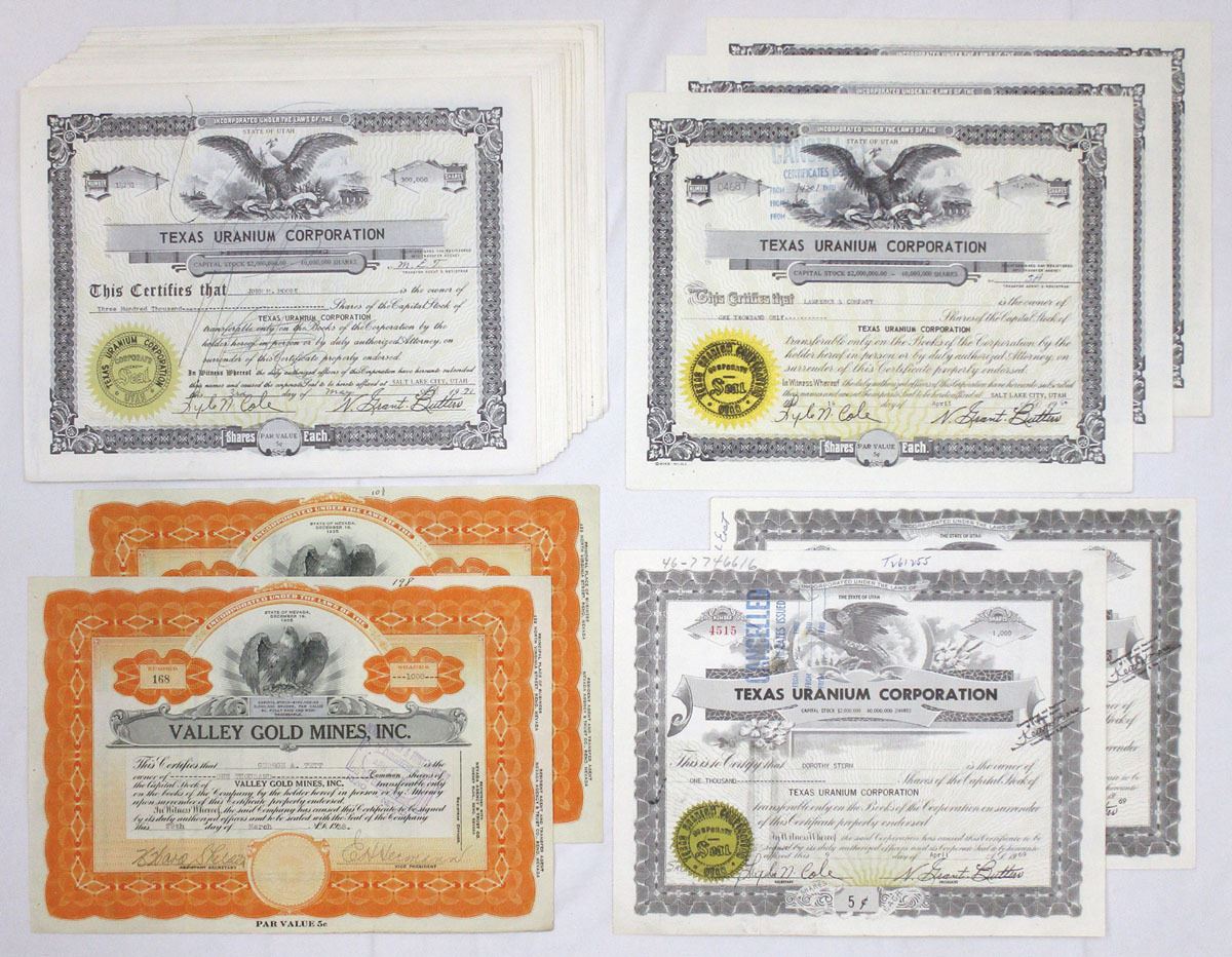 Utah & Nevada, 1936-70. Lot of 30 I/U Stock Certificates from western mining ventures, Includes: Texas Uranium Corp. (28) and Valley Gold Mines, Inc. (2). Certificates show mixed denominations and formats across the group. VF to AU condition. (30). Sold "AS IS", no returns accepted.