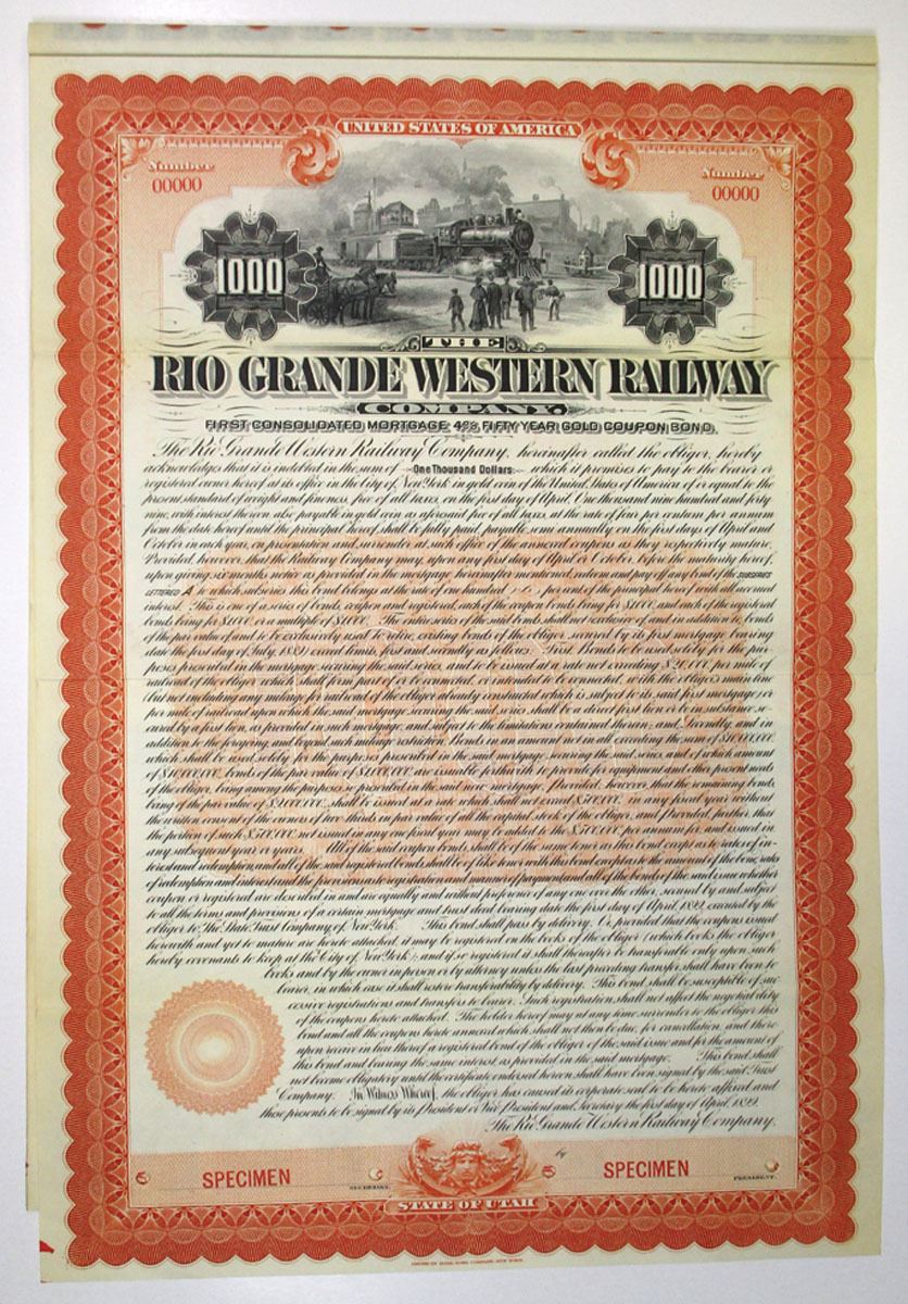 Utah, 1899. $1000 Specimen 4% First Consolidated Mortgage Fifty Year Gold Coupon Bond, Black with orange border and underprint, Train at top center at level crossing with people watching, Specimen overprints and POCs, XF to AU condition, ABNC.
