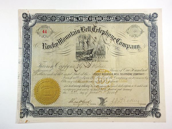 Utah Territory. 4 Shrs I/C Stock Certificate, Fine, Low serial number-44. Certificate is in fine condition with minor toning/staining along left edge of certificate.