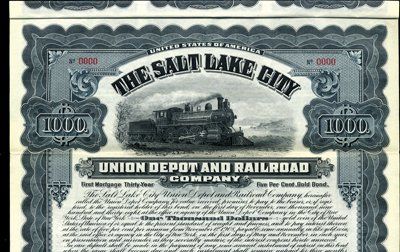 1908. $1,000. Specimen 1st Mortgage, 30 Year, 5% Gold Bond . Slate blue border. Speeding locomotive. Coupons attached. Red specimen overprints, POC's and "00000" serial numbers. XF condition. Rare and attractive bond. Unlisted railroad in Cox. ABNC.