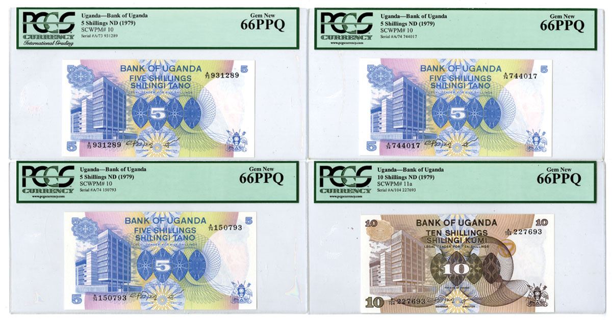 Uganda, ND (1979). Lot of 4 Issued Banknotes, Includes: 5 Shillings, P-10 (3) and 10 Shillings, P-11a. All four banknotes are PCGS graded Gem New 66 PPQ. (4). Sold "AS IS" no returns accepted.