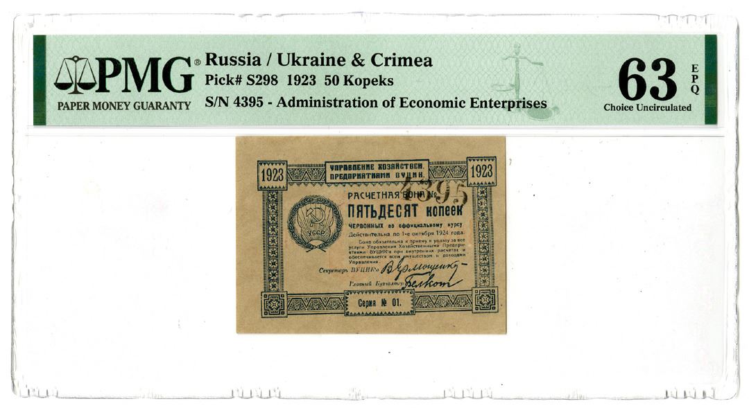 Russia / Ukraine & Crimea. 1923. 50 Kopeks, P-S298, issued banknote, PMG Graded Choice Uncirculated 63 EPQ. This is the only example graded in the PMG census and also the highest graded to be offered at auction in over 7 years. Rare and desirable.