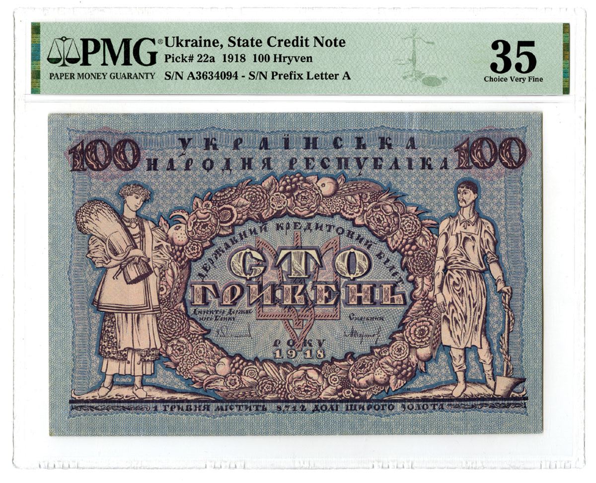 Ukraine, 1918. 100 Hryven, P-22a, Issued Banknote, Blue and m/c printing with farmer and farmers wife at right and left, Back is blue, S/N A3634094, PMG graded Choice Very Fine 35.
