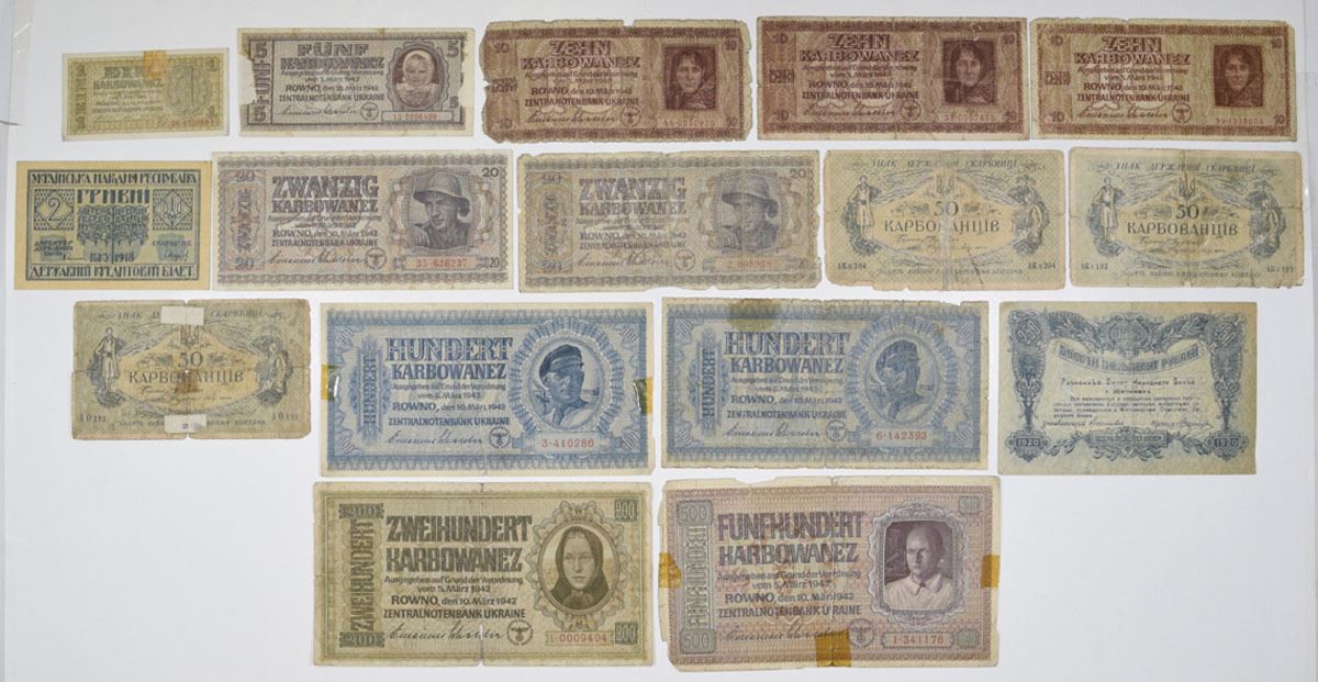 Ukraine......, ND (1918)-1920. Lot of 16 Issued Banknotes, Includes: State Treasury Notes, ND (1918), 50 Karbovantsiv, P-4 (2); 50 Karbovantsiv, P-5a; State Credit Notes, 1918, 2 Hryven, P-20a; Ukrainian Central Bank, 1942, 1 Karbowanez, P-49; 1942, 5 Karbowanez, P-51; 1942, 10 Karbowanez, P-52 (3); 1942, 20 Karbowanez, P-53(2); 1942, 100 Karbowanez, P-55 (2); 1942, 200 Karbowanez, P-56; 1942, 500 Karbowanez, P-57; National Bank Treasury Notes, 1920, 250 Rubles, P-S347. Notes range from Good to VF condition. (16). Sold "AS IS" no returns accepted.