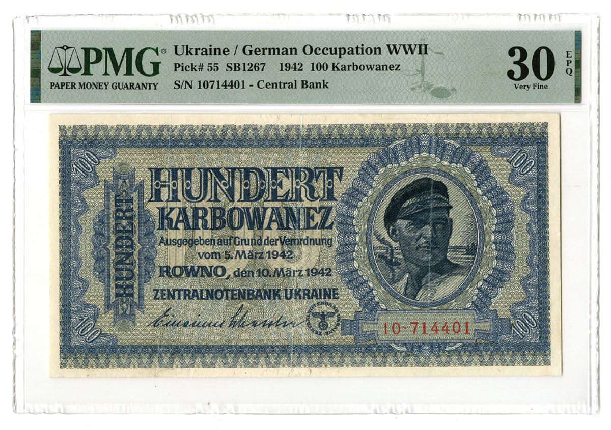 Ukraine - German Occupation WWII, 1943. 100 Karbowanez, P-55 SB1267, Issued Banknote, Dark blue on light blue and tan underprint with seaman at right, Back is blue with denomination at center, S/N 10714401, PMG graded Very Fine 30 EPQ.