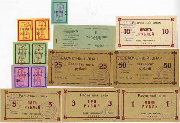 Collection of many things. 1987 10 denomination note, Collective Farm named for the October Revolution from the Ukrainian region of Ukraine S.S.R. Coupons from the "ETM" Electrotyazhmash factory, which made turbo generators, in all denominations. And Agricultural business coupons from the Borki and Kharkov Regions. 15 pieces in total.