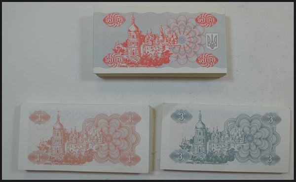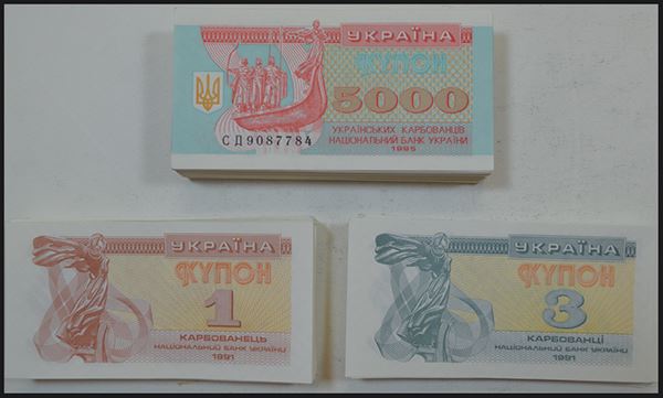 Ukraine. 1, 3, 5000 Karbovantsiv; P-81a, 82a, 93a, 93b. Generally Extremely Fine oe better. Over 300 pieces total.