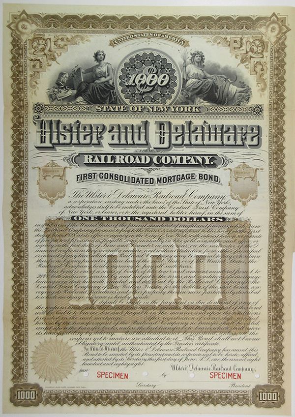 New York. $1000 Specimen 5% First Consolidated Mortgage Coupon Bond, with two illustrated female figures in recline at top. Red specimen overprints, no serial number, POC's, VF condition, printed by ABNC. Listed as issued but not listed as specimen. Only 2 examples were found in the ABN Archives in 2002.