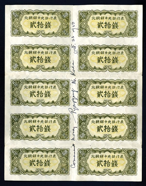 Uncut Sheet of 1947 North Korean Notes - U.S. Military Related. Uncut sheet of ten 20 Chon Pick 6 North Korean Notes. "Communist Money Pyongyang No. Korea Oct. 23, 1950" in pen in the gutter between the notes. Folds between the notes, which are all AU or so. Perhaps a souvenir of the Korean War which began in June of 1950.
