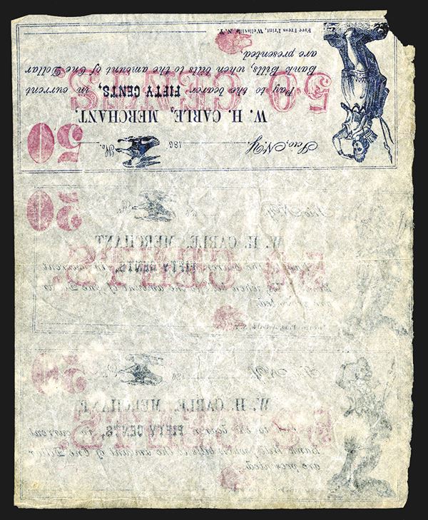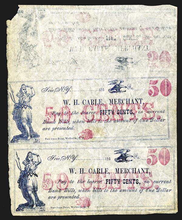 Scio, New York. W. H. Carle, merchant, red and blue, uncut vertical sheet of three 50 Cent remainder notes by Free Press Print, Wellsville. F-VF, but one note is missing a corner.